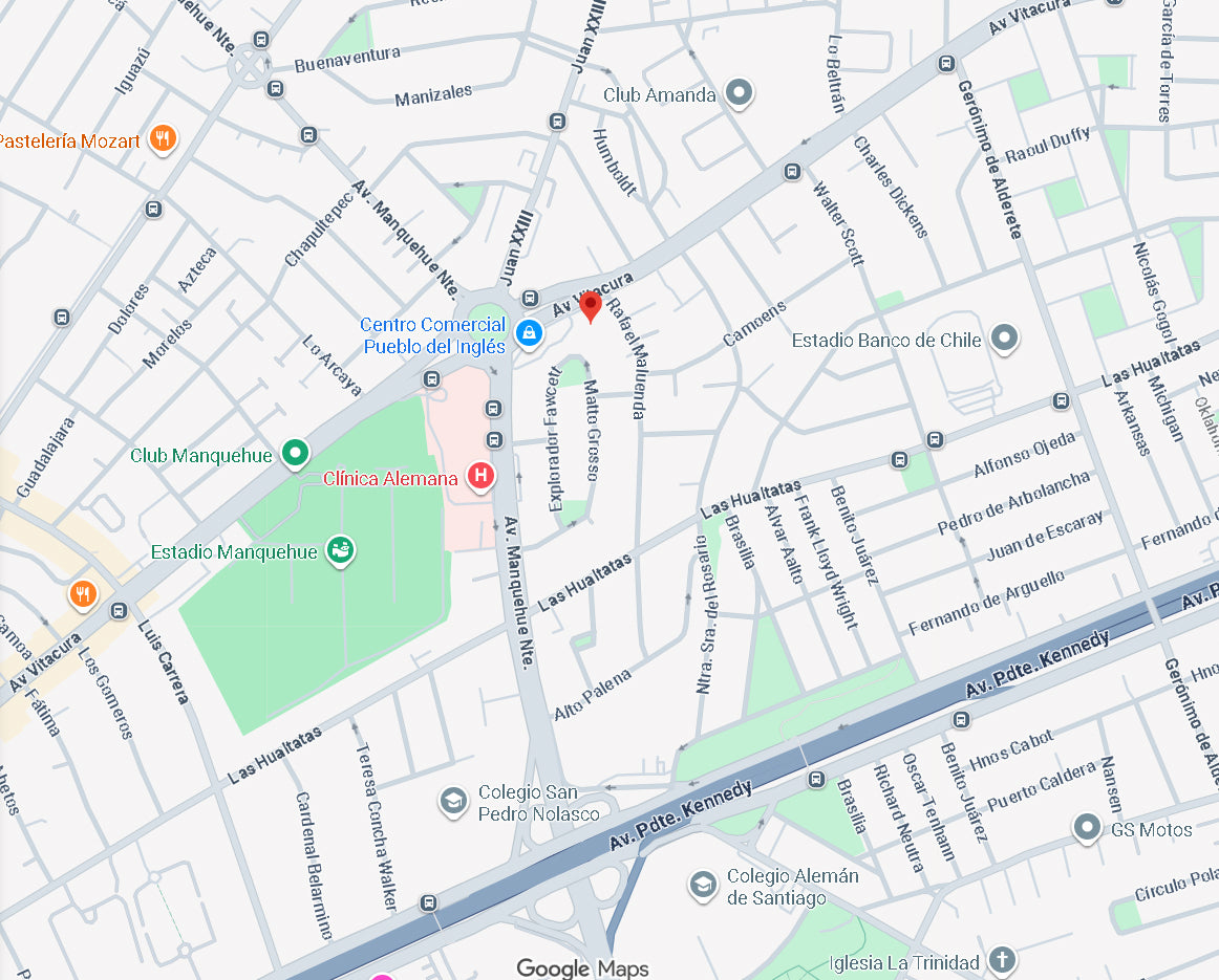 Nuestra tienda tiene dos accesos, uno por el interior del Pueblo del Inglés, y otro entrando directamente por Vitacura, al costado del supermercado Santa Isabel (tenemos un toldo azul bastante llamativo).